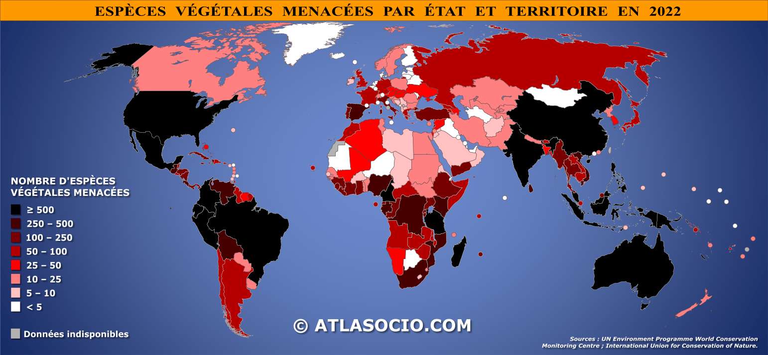 Carte du monde relative à la répartition des espèces végétales menacées par État et territoire. L’analyse porte sur les plantes vasculaires indigènes, considérées comme représentatives de la flore locale. Les données sont issues du Centre mondial de surveillance de la conservation du Programme des Nations Unies pour l’environnement (UNEP‑WCMC) et reposent sur la classification de la « Liste rouge des espèces menacées » établie par l’Union internationale pour la conservation de la nature (IUCN).