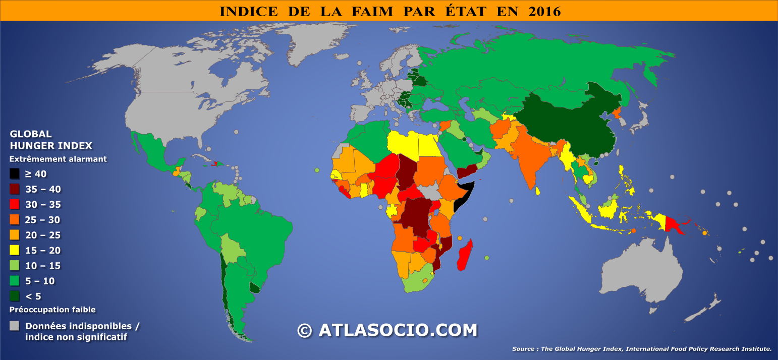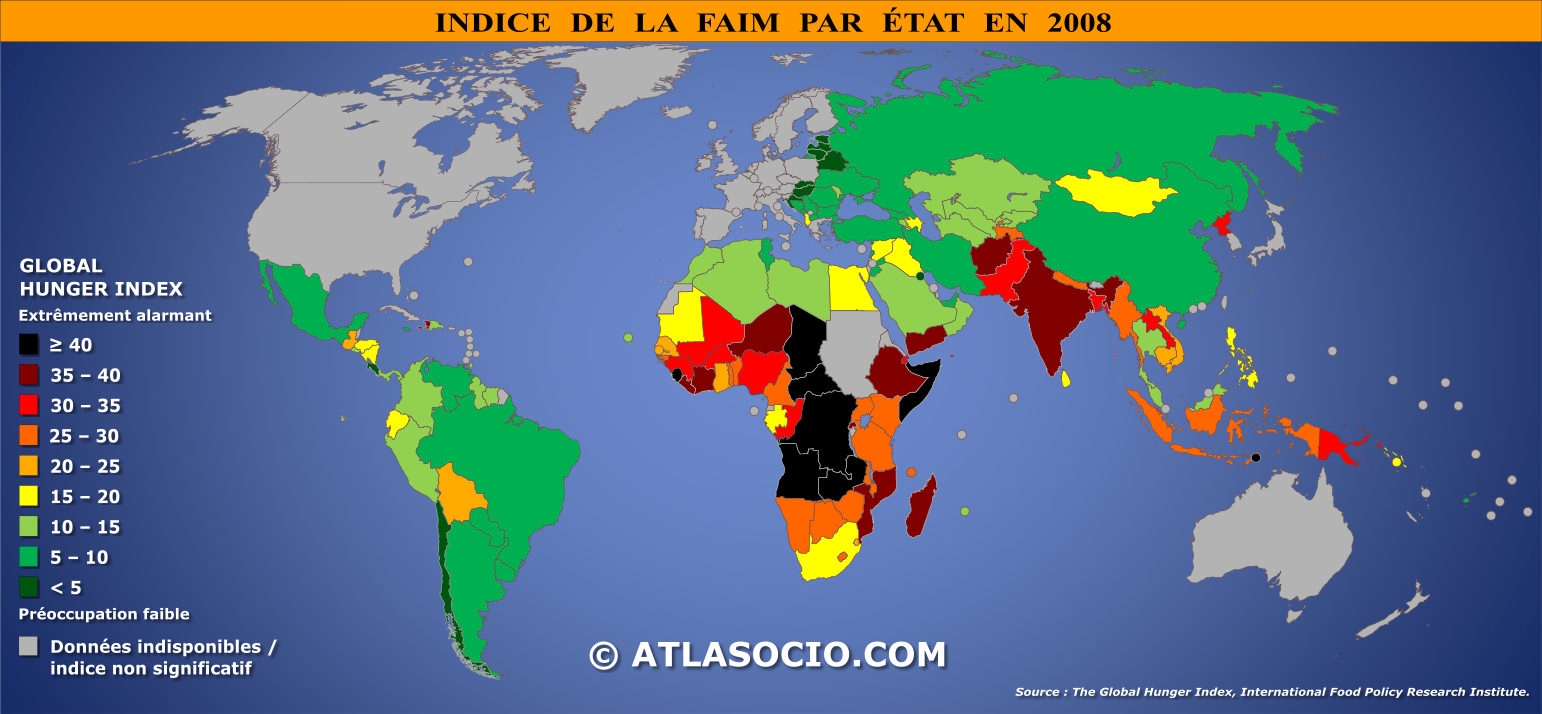 Carte du monde relative au Global Hunger Index ou « indice mondial de la faim ». Établi par l'International Food Policy Research Institute, l'indice de la faim – compris entre 0 (absence de famine) et 100 (famine généralisée) – mesure l'état de la faim au sein d'un État donné.