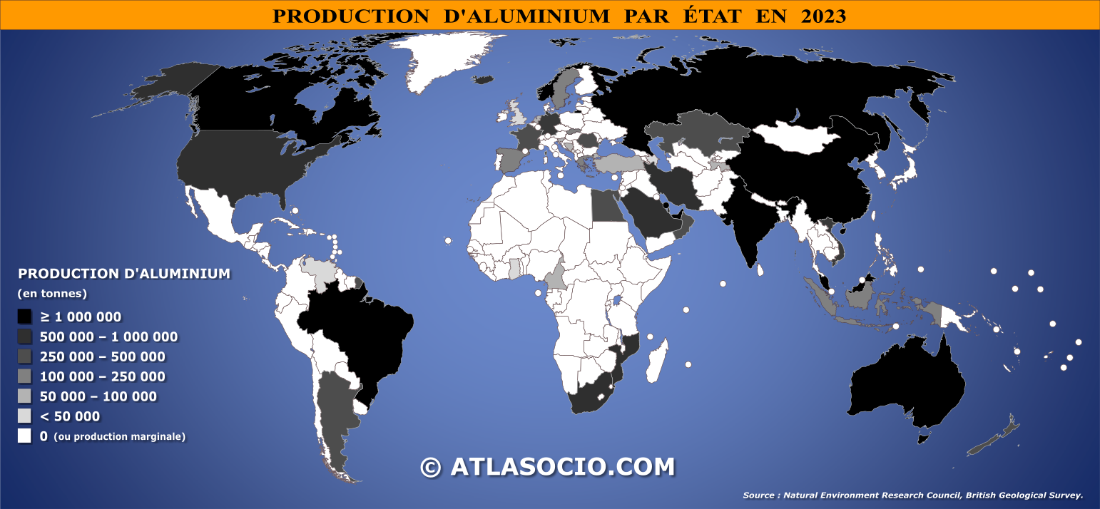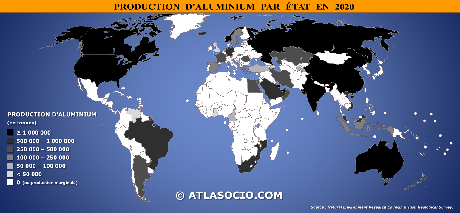 Carte du monde relative à la production d'aluminium par État, exprimée en tonnes (t). L'aluminium (de symbole Al) est un métal malléable de couleur argent, présent dans quasiment tous les segments de l'économie mondiale : les transports (automobiles, avions, camions, automotrices, navires maritimes...), les emballages (boîtes de conserve, feuilles...), la construction (fenêtres, portes, revêtements...), les biens de consommation durables (appareils électroménagers, ustensiles de cuisine...), etc.