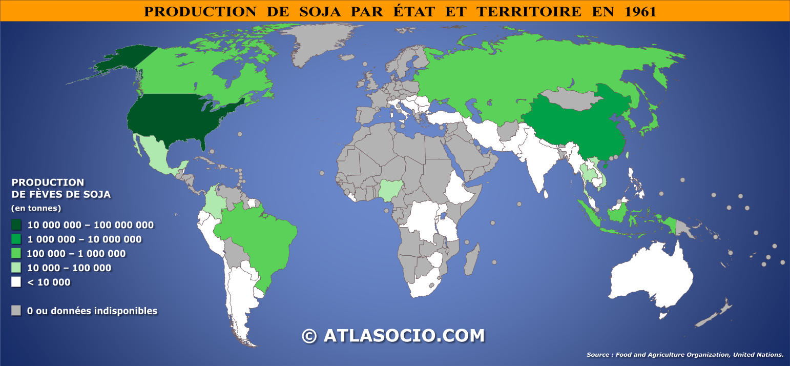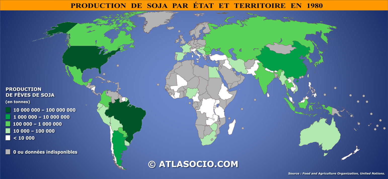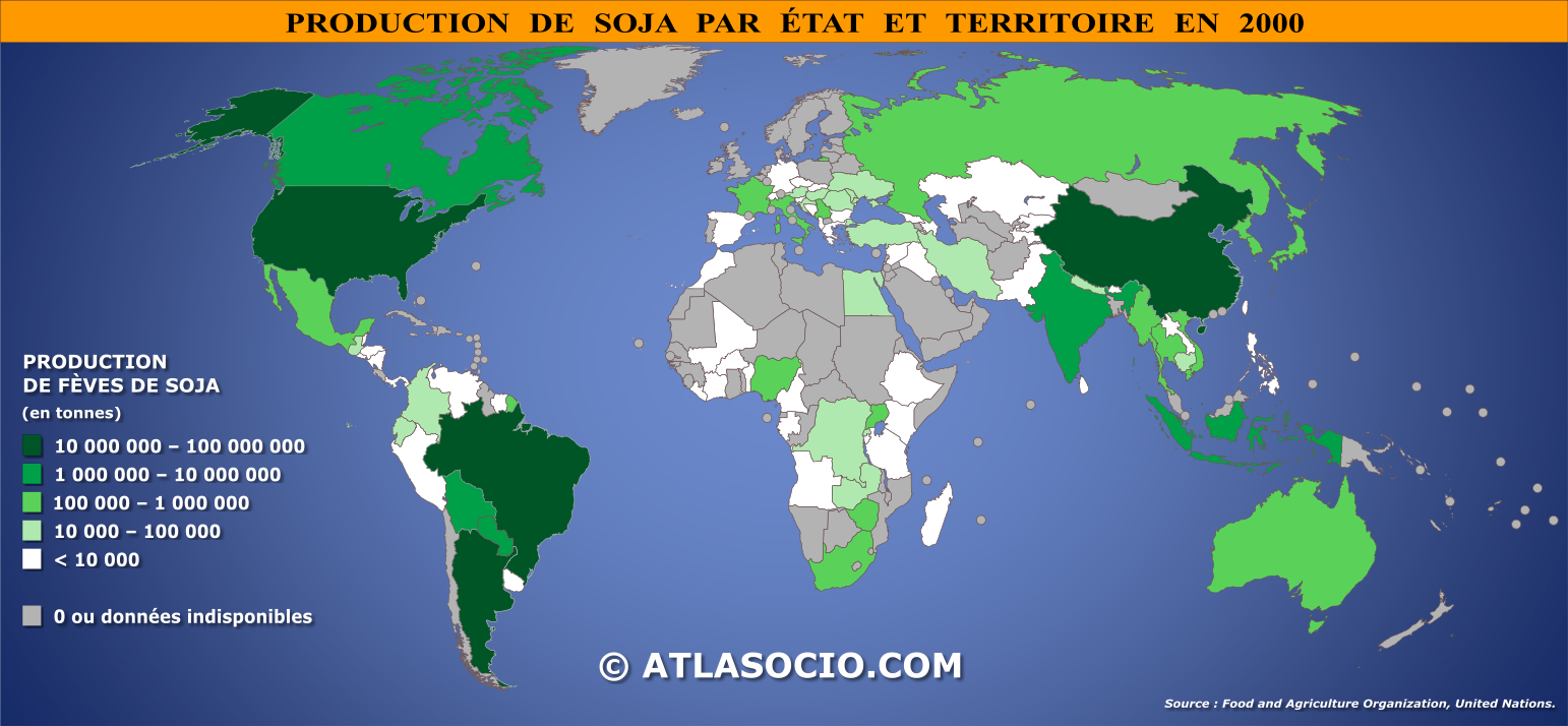 Carte du monde relative à la production de soja (fèves) par État, exprimée en tonnes (t). Le terme « soja », désignant la plante Glycine max, dérive indirectement du chinois jiàngyóu (酱油), signifiant « sauce », via le japonais shōyu puis le néerlandais soya. La production mondiale de soja a fortement augmenté depuis la seconde moitié du XXe siècle, sous l’effet de l’extension des surfaces cultivées et de l’intensification agricole.