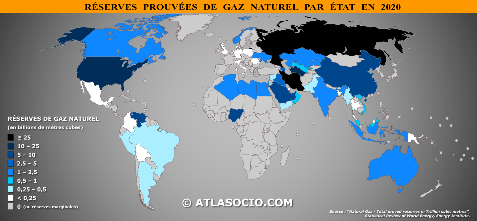 À savoir : Les réserves prouvées de gaz naturel sont généralement exprimées en billions de mètres cubes (ou milliers de milliards de mètres cubes). Dans le système de mesure anglo-saxon (États-Unis, Royaume-Uni…), il s’agit du terme « trillion » (Tm³), équivalent du « billion » français.