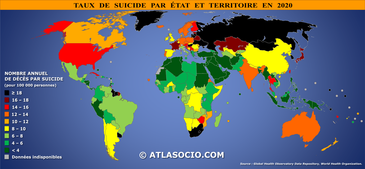 Carte du monde relative au taux de suicide par État, soit le nombre de décès – exprimé pour 100 000 habitants – consécutifs à un acte volontaire de se donner la mort au cours d'une année civile. Cette représentation cartographique permet de visualiser les disparités régionales et nationales en matière de mortalité par suicide, en mettant en évidence les pays où ce phénomène constitue un problème de santé publique majeur et ceux où il reste plus marginal.