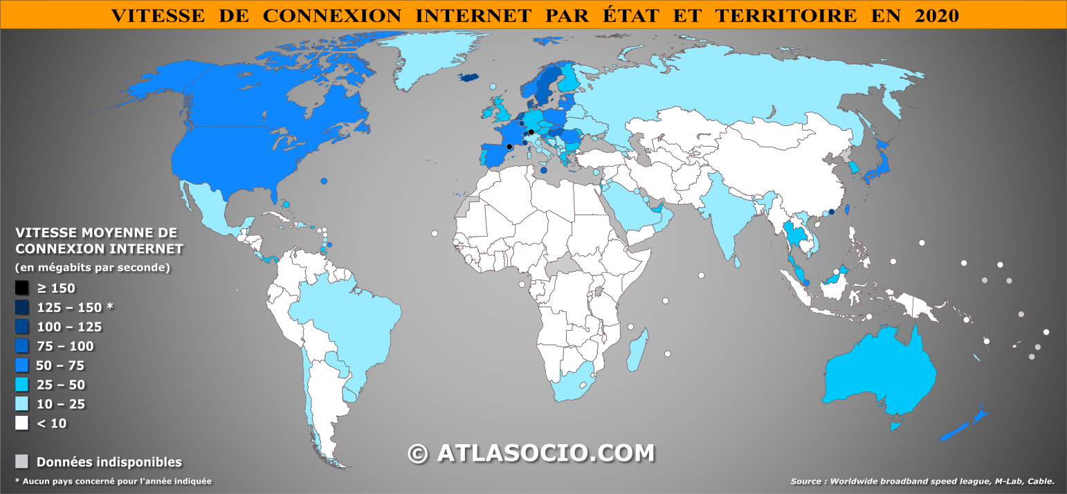 La représentation cartographique met en évidence de forts contrastes géographiques dans les niveaux de performance des réseaux Internet à l’échelle mondiale. Les vitesses les plus élevées se concentrent principalement en Europe occidentale et septentrionale, en Asie orientale ainsi que dans certains micro-États et territoires fortement urbanisés, où le déploiement de la fibre optique et des infrastructures à très haut débit est particulièrement avancé. À l’inverse, de larges portions de l’Afrique subsaharienne, de l’Asie du Sud et de certaines régions d’Amérique centrale affichent des vitesses nettement plus faibles, traduisant des retards structurels dans l’accès aux infrastructures numériques.