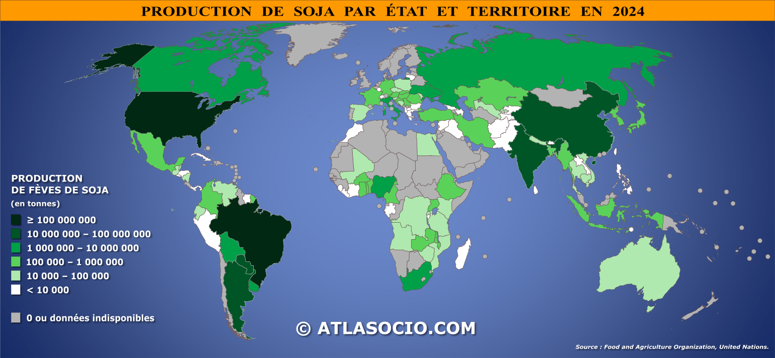 La production mondiale de soja a fortement augmenté depuis la seconde moitié du XXe siècle, sous l’effet de l’extension des surfaces cultivées et de l’intensification agricole..